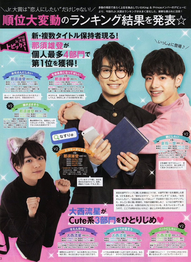 "독자가 뽑은 랭킹"과 똑같은 50부문에, Jr.들이 투표! 그 랭킹 결과로부터는, 진짜 모습을 잘 알고 있는 사람들과의 리얼한 관계성이 보인다. 또, 본전과 더블 수상인 Jr.가 있기도 하고, 연패를 놓친 Jr.가, 여기서는 1위로 복귀하기도. 숨겨진 드라마에도 주목!